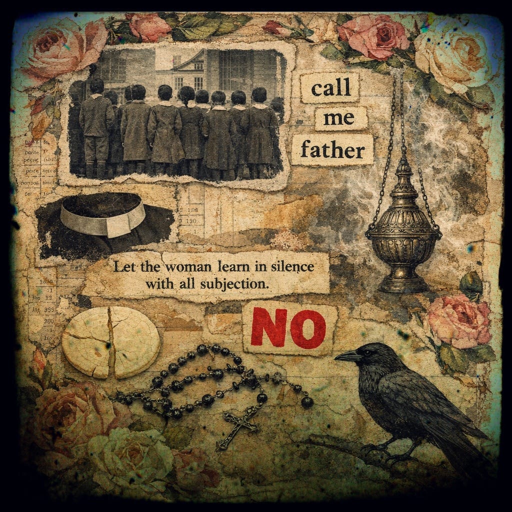 Obedience is love is survival is love- the man who speaks for god speaks god. Do not ask which god. The frankincense hides the stink of power / cassock sweat / who touched you in the sacristy. They said: kneel here. Confess this. Call me Father. Your body is a question only we can answer. (I was eight. The thurible swung. I threw up in the parking lot after.) They said: the book is closed, the interpretation fixed, your doubt a demon we can exorcise- How much did they charge you? Did you pay in cash or in years? They tried to make us smaller than the doctrine, to swallow the wafer of their truth until our throats forgot how to form- No. The word is: no. But some of us choked- spit the body of christ into our fists,