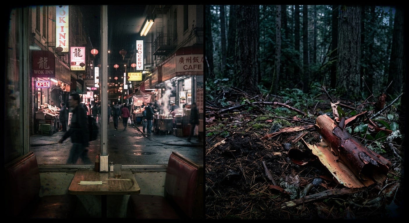 in the back booth of the noodle shop the boy is asleep with his cheek on the vinyl his mother carries the tray past him for the fourth time she does not look down on the pine needles behind the cabin the boy is asleep with his cheek on his jacket his father is checking the last snare before dark he does not look back